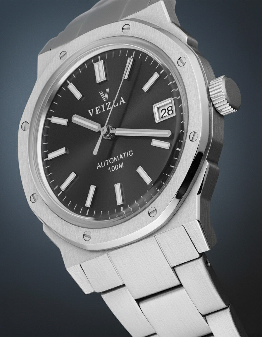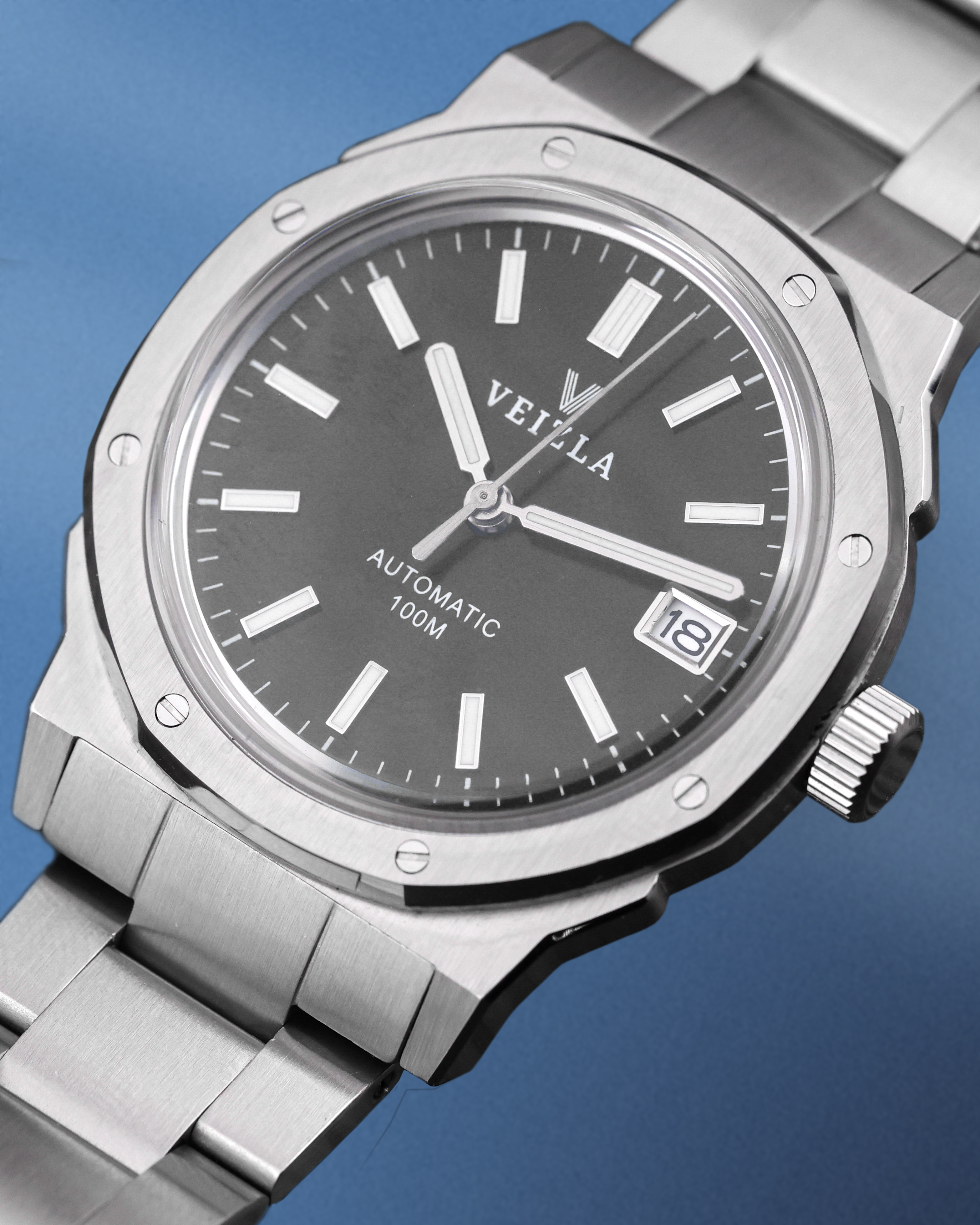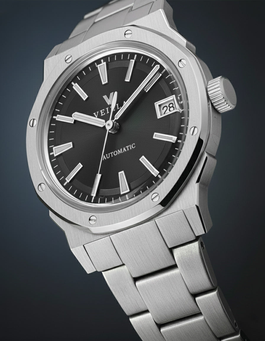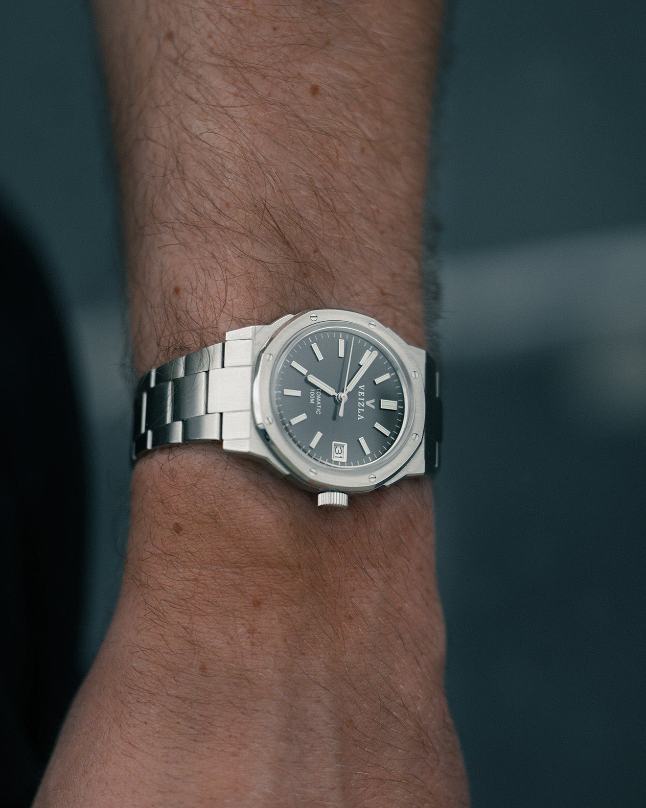 A classic sports watch, designed for everyday wear. The angular case with its sharp facets gives the piece real wrist presence while remaining perfectly balanced at 37 mm. A domed sapphire crystal curves seamlessly over the hands, adding depth while keeping the profile slim. Crafted from solid 316L stainless steel, the watch has a reassuring weight, refined finish, and lasting durability. Its compact proportions and crisp lines allow it to move easily between casual and formal wear. Altogether, a refined sports watch that unites strength, elegance, and timeless design.