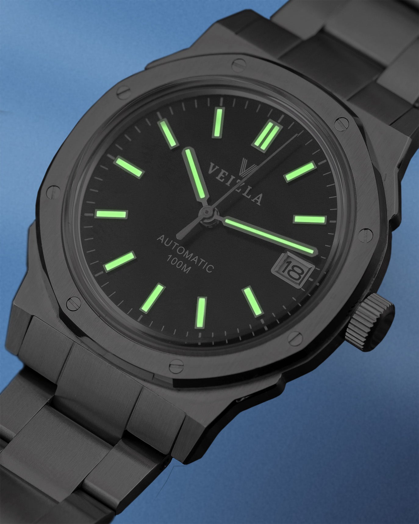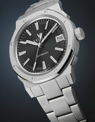The deep black sunburst dial offers a classic, understated look, elevated by sharp lume for effortless readability in the dark.