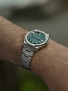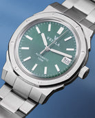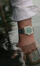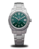 The emerald green dial shimmers with a lively sunburst texture, adding a bold yet refined character.